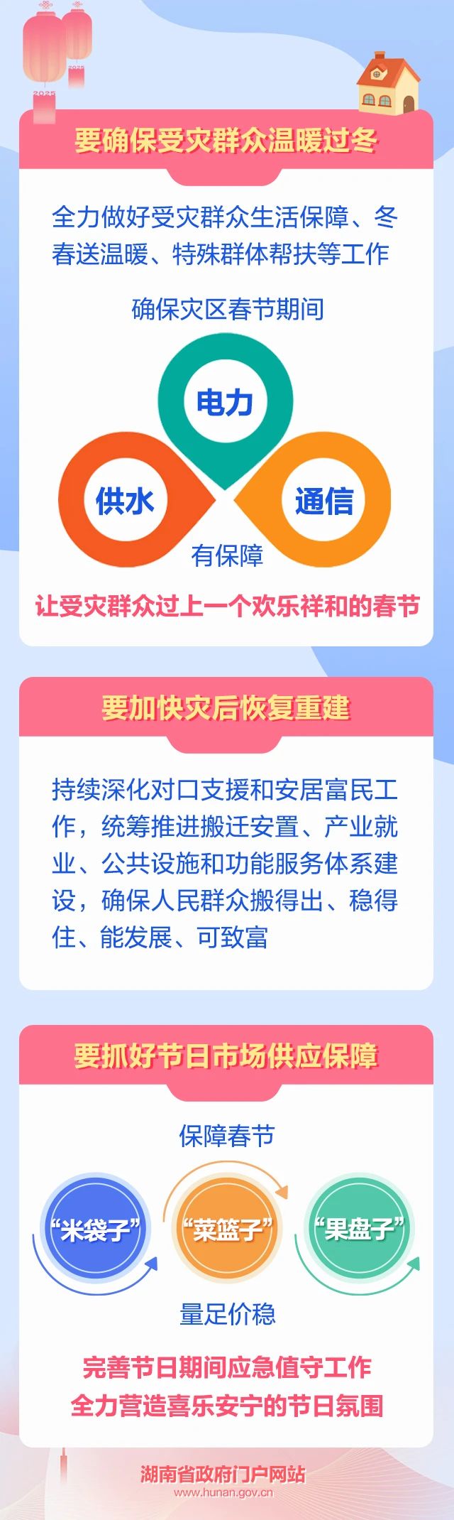 全力做好受灾群众生活保障、冬春送温暖、特殊群体帮扶等工作,确保灾区春节期间电力、通信、供水有保障,让受灾群众过上一个欢乐祥和的春节。