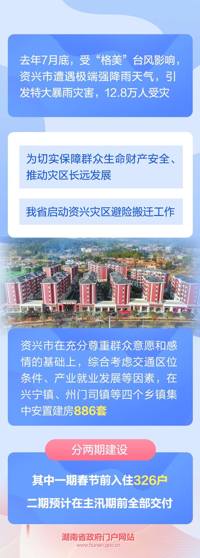 去年7月底,受“格美”台风影响,资兴市遭遇极端强降雨天气,引发特大暴雨灾害,12.8万人受灾。为切实保障群众生命财产安全、推动灾区长远发展,我省启动资兴灾区避险搬迁工作。资兴市在充分尊重群众意愿和感情的基础上,综合考虑交通区位条件、产业就业发展等因素,在兴宁镇、州门司镇等四个乡镇集中安置建房886套,分两期建设,其中一期春节前入住326户,二期预计在主汛期前全部交付。