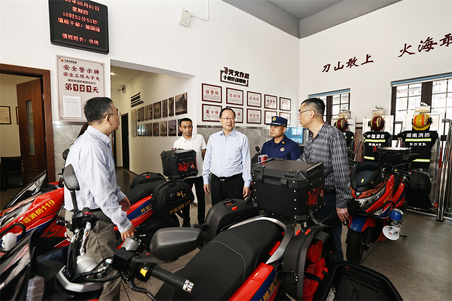 5月1日上午,毛伟明来到潮宗街消防救援站察看消防救援设施。