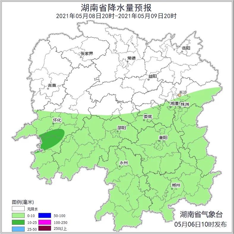 5月6日20时至5月7日20时,湘中以南阴天有小到中等阵雨或雷阵雨,湘西南、湘东部分大雨,其中怀化南部、邵阳西部、株洲中部、衡阳东部、郴州北部局地暴雨,其他地区小雨转多云,湘北局地早晨有雾;南风2~3级;最高气温湘北26~28℃,湘东南22~24℃,其他地区24~26℃;最低气温湘西北15~17℃,其他地区18~20℃。