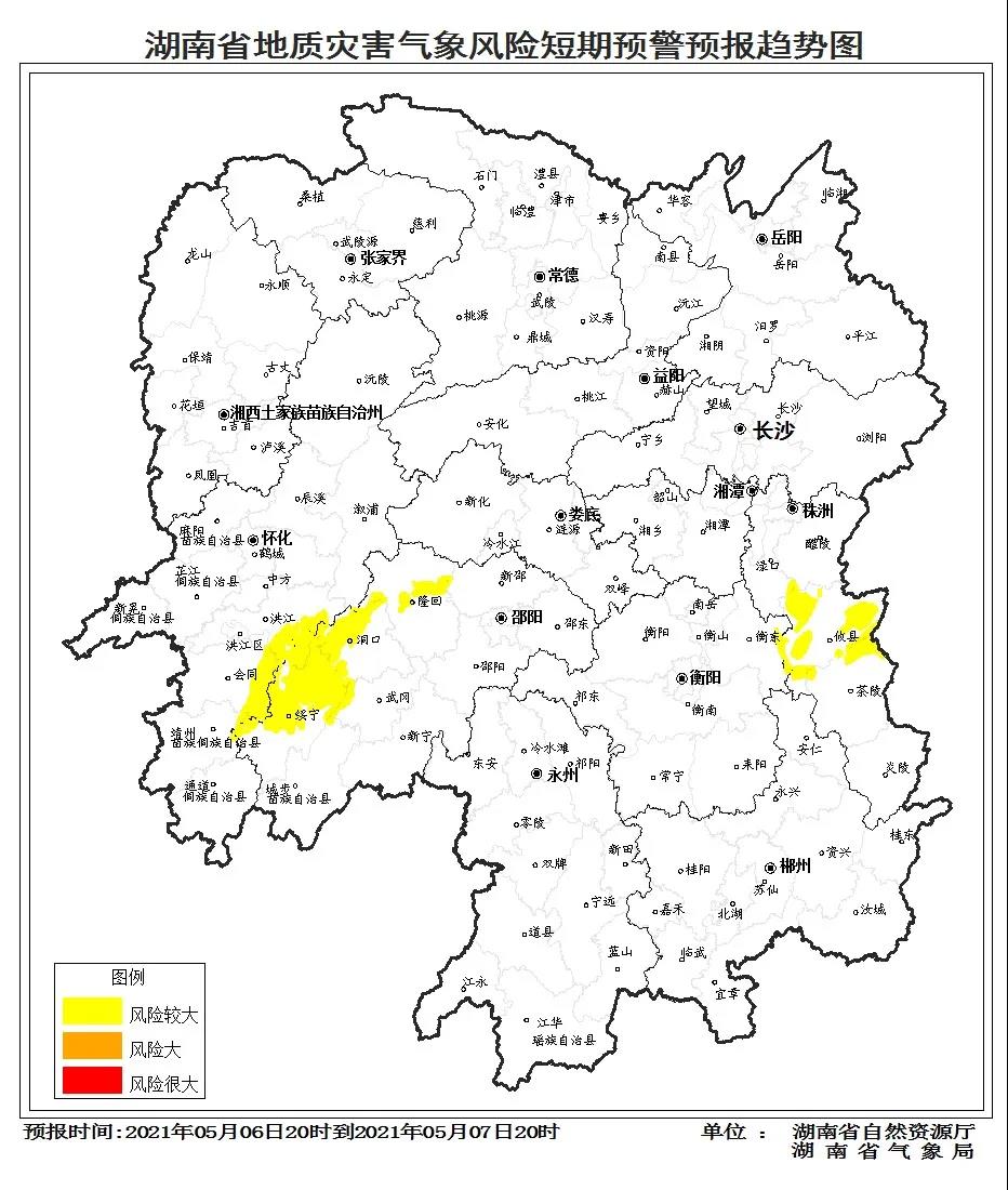 湖南省自然资源厅与湖南省气象局联合发布,自5月6日20:00至7日20:00,受降雨影响,湘东、湘西南局部区域发生突发性地质灾害风险较大(黄色预警)。
