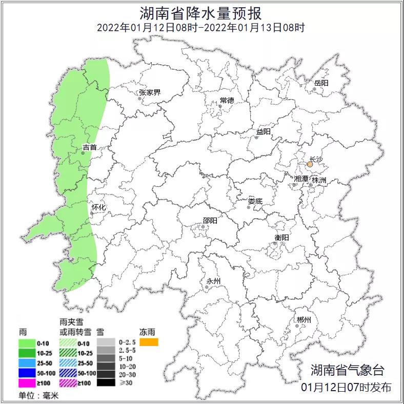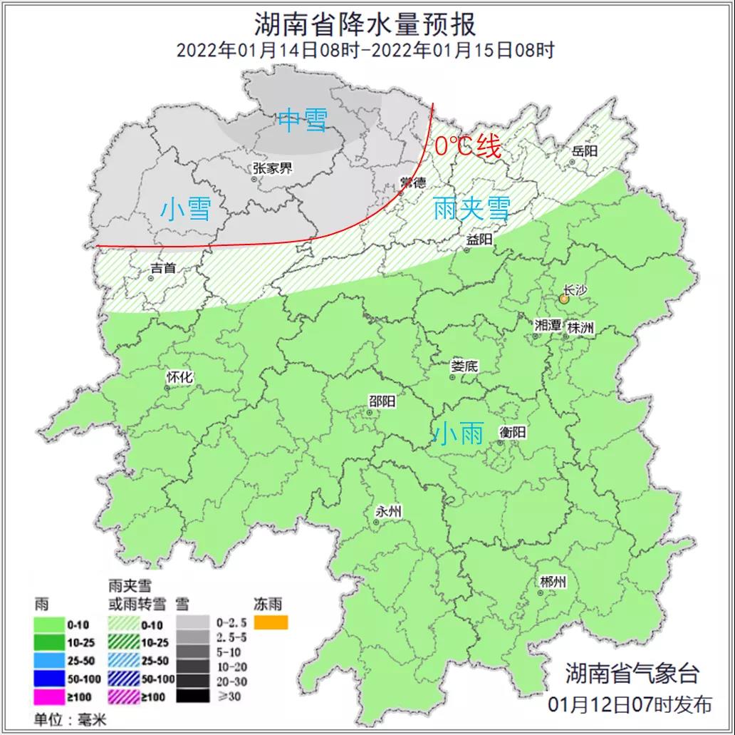 受冷空气影响,13日晚至14日湘北部分地区有雨夹雪或雪,湘西北局地中到大雪,最低气温可降至0℃左右;15日至17日全省自北向南将有一次大雨天气过程,其中16日晚至17日湘西北高海拔地区有雨夹雪或雪。