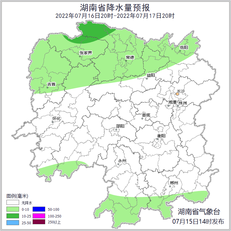15日20时至16日20时,怀化南部、邵阳南部、永州南部、郴州南部晴天间多云,午后局地有阵雨或雷阵雨,其他地区晴天;南风2~3级;最高气温湘南34~36℃,其他地区36~38℃;最低气温湘西、湘南25~27℃,其他地区28~30℃。