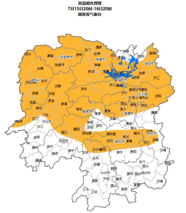 湖南省气象台07月15日16时发布高温橙色预警:预计15日20时至16日20时,长沙、株洲西部、湘潭、衡阳、邵阳北部、岳阳、常德、张家界、益阳、怀化北部、娄底、湘西州将达到37℃以上高温,局部地区将达39℃以上,请做好防范。