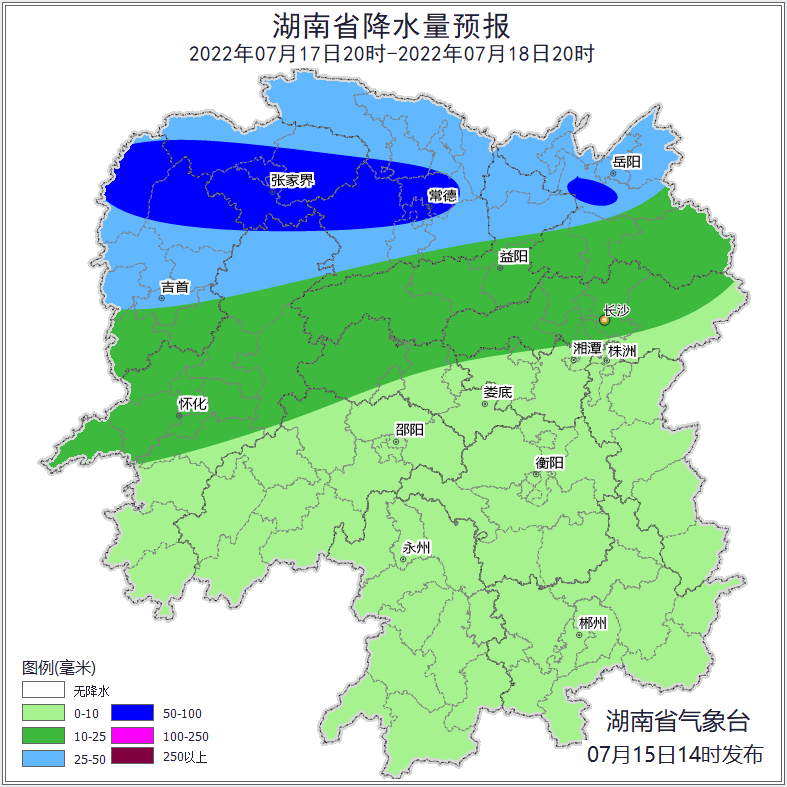17日20时至18日20时,湘西州、张家界、怀化北部、常德、益阳北部、岳阳北部阴天间多云有大雨,其中龙山、永顺、张家界市区、桑植、慈利、常德市区、桃源、临澧、岳阳县有暴雨,其他地区多云间阴天有小到中等阵雨或雷阵雨;南风2~3级;最高气温32~34℃;最低气温湘西25~27℃,其他地区27~29℃。