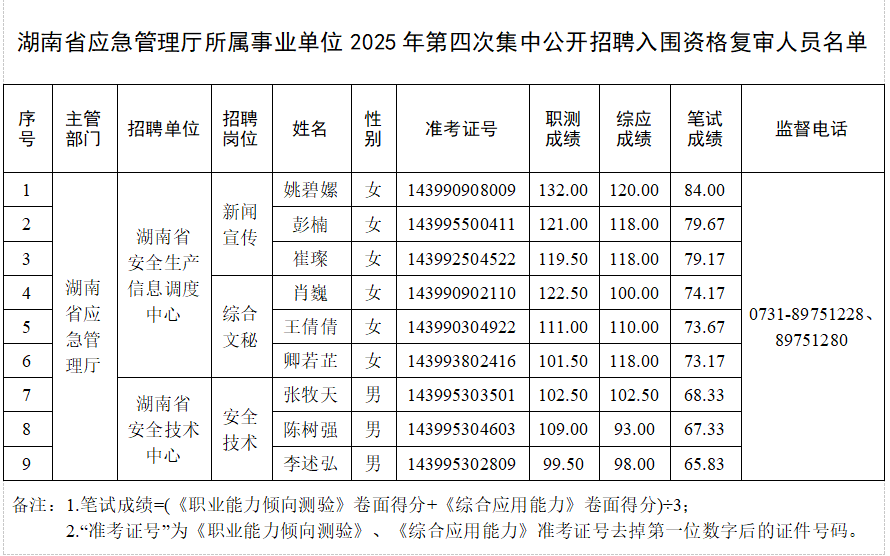 湖南省应急管理厅所属事业单位2025年第四次集中公开招聘入围资格复审人员名单公示