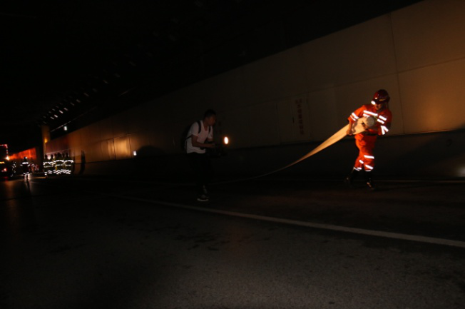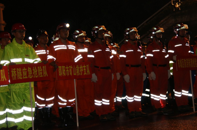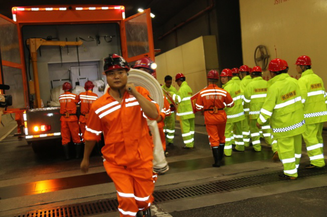 这次演练中,有一支身穿橘黄色印有“邵阳救援”字样的抢险队伍显得尤为耀眼,只见他们训练有素的飞奔至南湖路隧道内,一气呵成的完成了连接电源开关,安装、调试水泵,搬运、铺设、连接水管等隧道抢险排水工作。这支队伍就是邵阳市矿山救护支队。