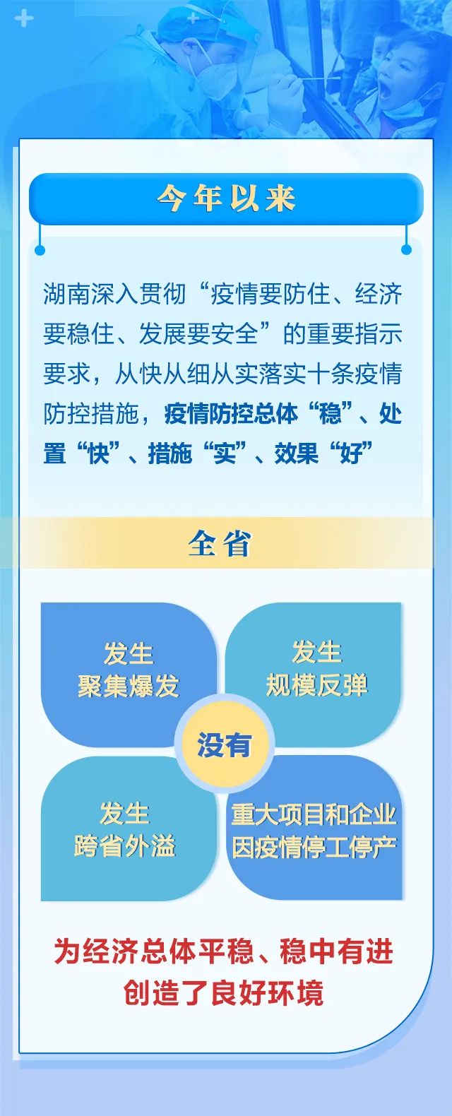 他说,今年以来,湖南深入贯彻“疫情要防住、经济要稳住、发展要安全”的重要指示要求,从快从细从实落实十条疫情防控措施,疫情防控总体“稳”、处置“快”、措施“实”、效果“好”,全省没有发生聚集爆发、没有发生规模反弹、没有发生跨省外溢,没有重大项目和企业因疫情停工停产,为经济总体平稳、稳中有进创造了良好环境。