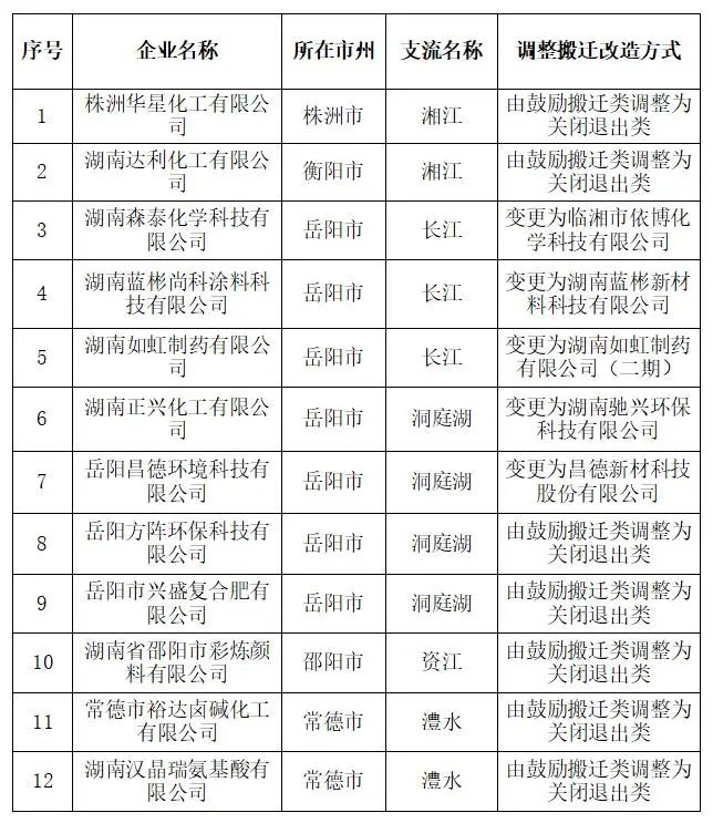 根据《湖南省人民政府办公厅关于印发<湖南省沿江化工企业搬迁改造实施方案>的通知》(湘政办发〔2020〕11号)有关要求,经有关市州人民政府申请,省工信厅、省应急管理厅、省生态环境厅组织专家现场调查,并报省人民政府审定同意,原沿江化工企业搬迁改造名单中的5家企业同意变更企业名称,7家企业同意调整搬迁改造类型(均由搬迁调整为关闭),同意1家企业列入我省第四批沿江化工生产企业名单。现将同意变更名称或调整类型的沿江岸线1公里范围内化工生产企业名单和第四批沿江岸线1公里范围内化工生产企业名单予以公告。