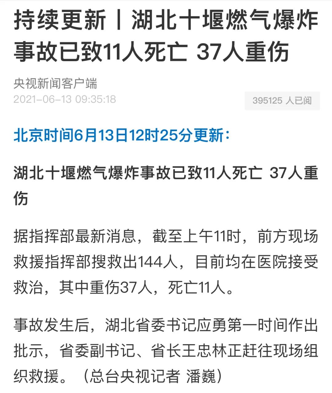 据央视新闻客户端报道,今天(13日)早晨6:30,湖北十堰市张湾区艳湖小区发生一起燃气爆炸事故。截至上午11时,已搜救出144人,目前均在医院接受救治,其中重伤37人,死亡11人。