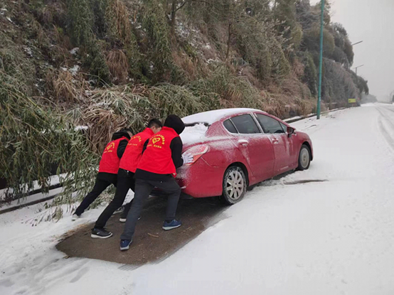 桃江县浮邱山乡组织党员干部在辖区主干道铲雪除冰,救援被困车辆,全力做好春运保畅工作。