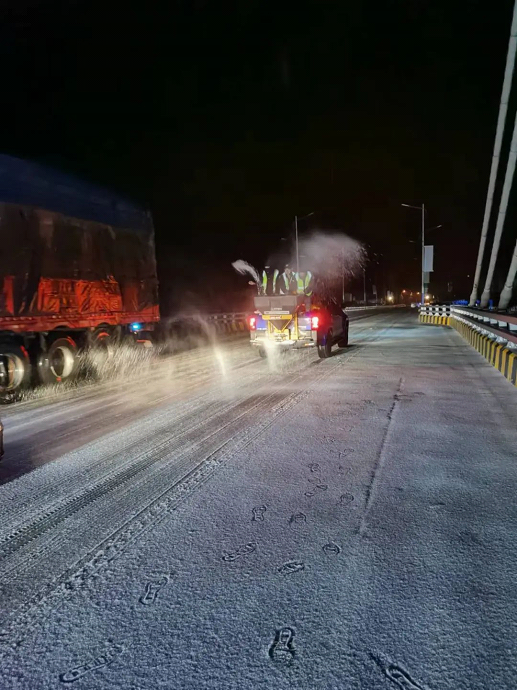 南县公路部门对辖区内国省道桥梁桥面、弯道、坡道等结冰路面撒布融雪剂,确保道路安全畅通。