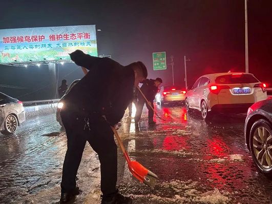 澧县交警加大警力值守,在重点桥梁易结冰路段进行铲雪洒盐除冰作业,执勤民警24小时坚守桥面,不间断执勤巡逻,保证路面行车安全、道路桥面畅通。