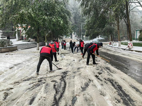 赫山区会龙山街道组织志愿者在辖区主要路段开展除冰铲雪保畅。