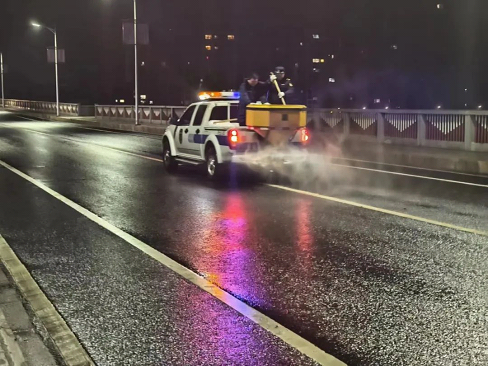 津市市城管局应急分队在澧水大桥撒布融雪剂,预防桥面沥青路面结冰,确保大桥通行畅通。