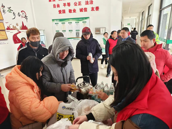 安化县冷市镇组织机关干部、社区志愿者,为被困群众送上食物、开水。