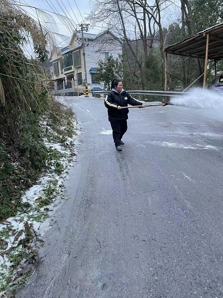 泸溪县解放岩乡组织人员在X047县道利略村大塘坳路段结冰路面撒工业盐,确保道路通畅,并树立警示牌,提醒过往车辆谨慎驾驶。