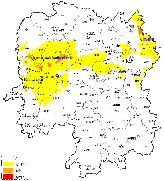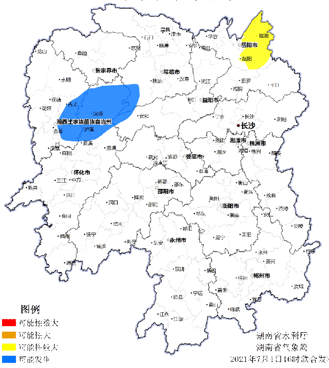 自7月1日 20:00至2日 20:00,受降雨影响,常德市、湘西自治州、益阳市、怀化市等局地可能发生山洪灾害(蓝色预警),岳阳市等局地发生山洪灾害的可能性较大(黄色预警)。