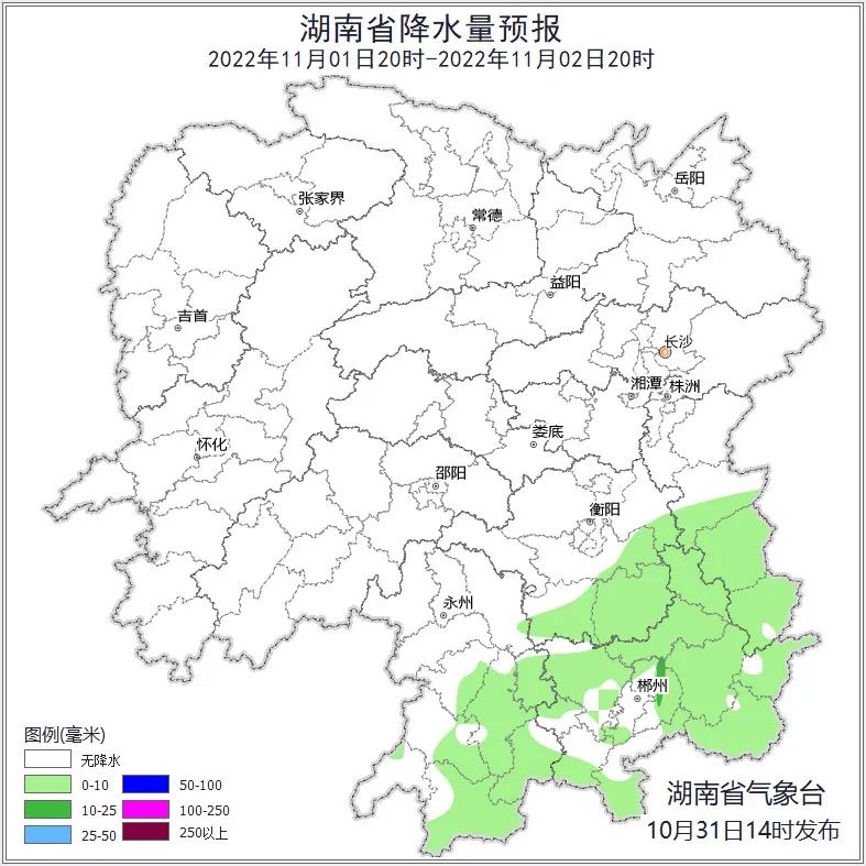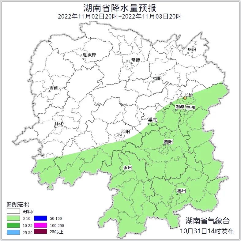 11月1日20时至2日20时,株洲南部、衡阳南部、永州、郴州多云转阴天有阵雨,其他地区晴天到多云;北风2~3级;最高气温湘南23~25℃,其他地区25~27℃;最低气温湘西、湘北10~12℃,其他地区12~14℃。