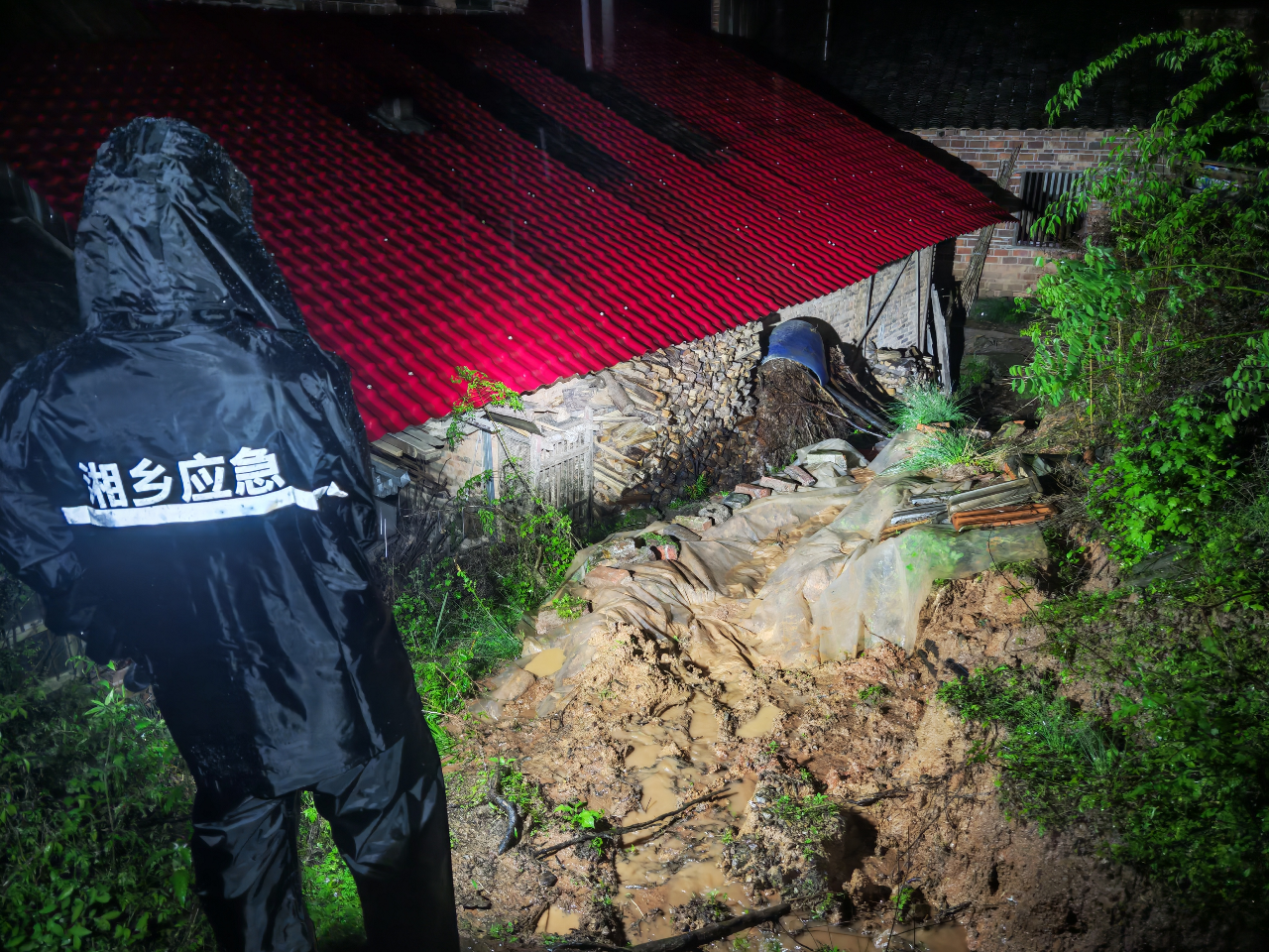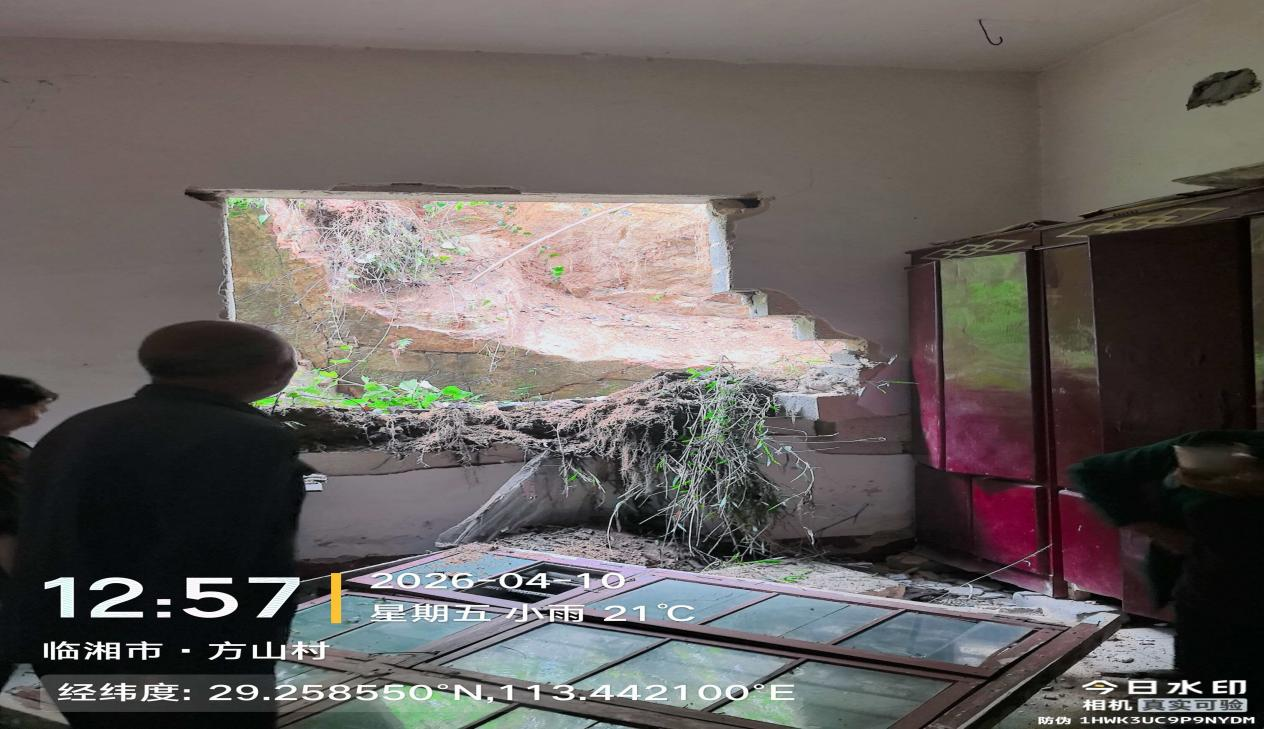 益阳市桃江县桃花江镇横木村 4月10日20时30分,桃花江镇横木村安全专干潘高,村党支部书记李光华开展巡查时,发现一农户后山有泥土和碎石滚落,可能有山体滑坡风险,随即将情况上报。镇应急办接报后,第一时间组织人员前往现场对滑坡体进行处置。21时30分,镇应急办和村干部协助受威胁的1户5人转移至临时安置点。 11日1时许,险情扩大发生山体滑坡,近300立方米的滑体倾泻而下,其中约10立方米的岩石撞击门窗,致房屋多处受损。因预警精准,响应迅速,群众提前转移,未造成人员伤亡。