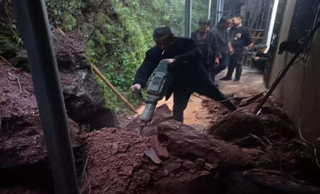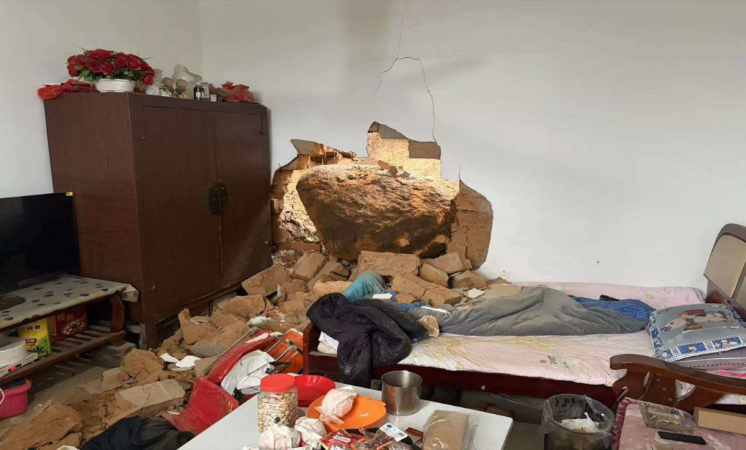15时12分,该处发生岩体崩塌,一块巨石滚落直接砸穿卧室墙体。因预判精准、上报及时、转移果断,无人员伤亡。