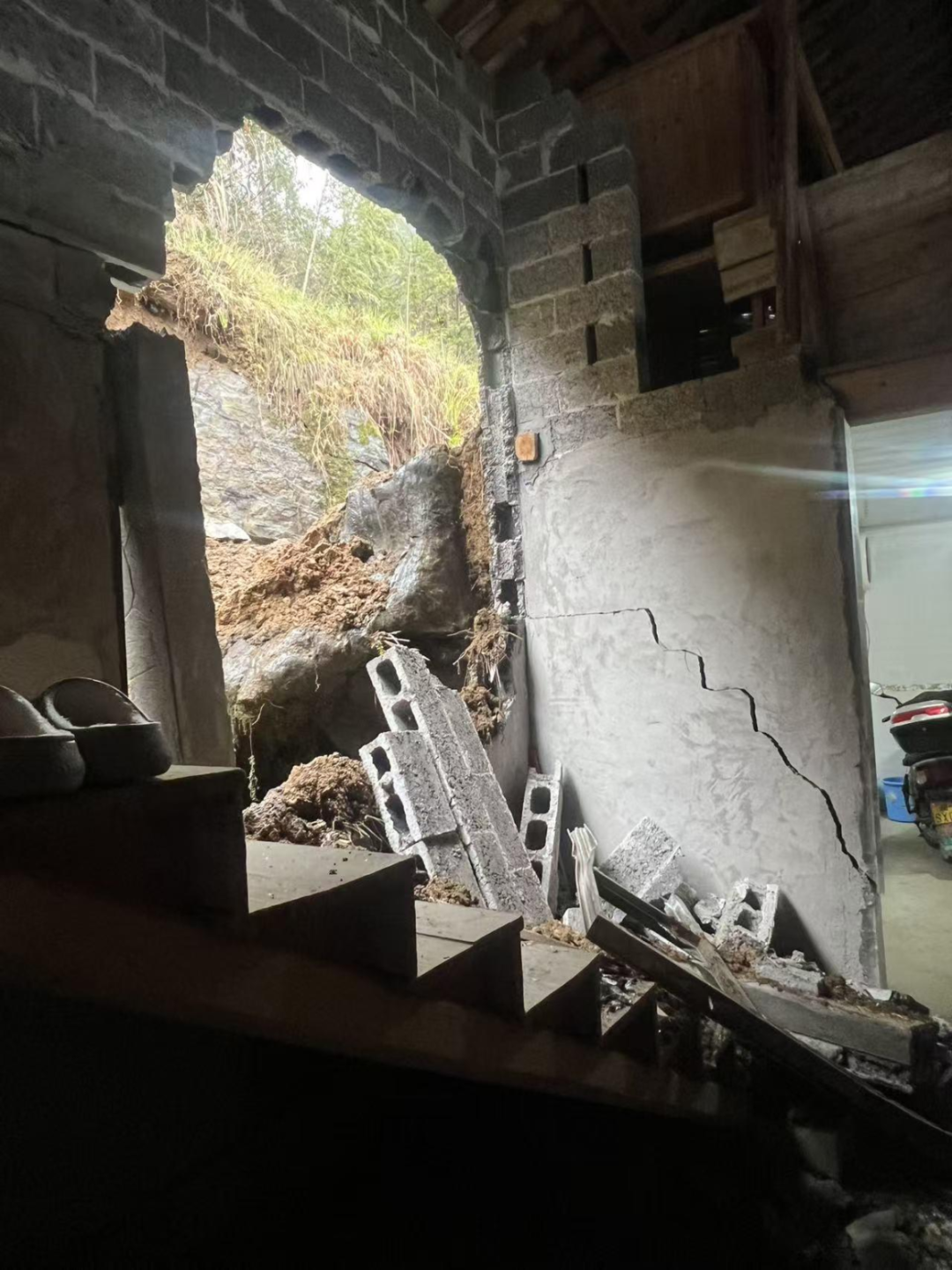 30日5时,屋后巨石滑落砸坏房屋墙体。由于发现及时、转移果断,无人员伤亡。